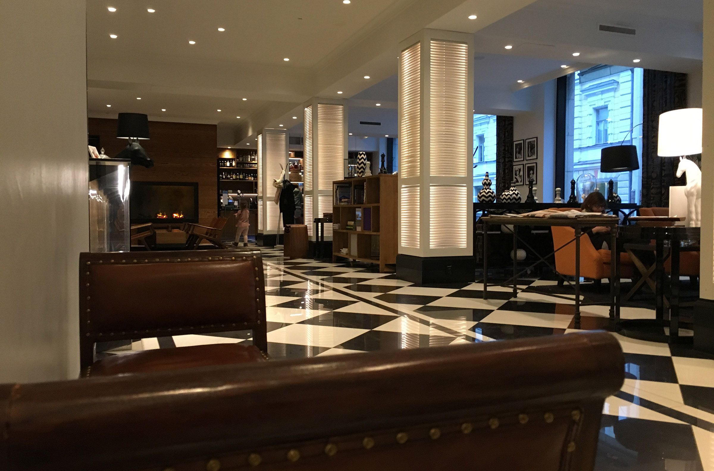 Jo hotellin aula vakuuttaa. Kodikas takkatuli, valtava hevosen muotoinen lattialamppu ja moderni siirtomaatyyli yhdistyvät luontevasti art decoon. Kuulostaa ehkä sillisalaatilta, mutta näyttää todella hyvältä.