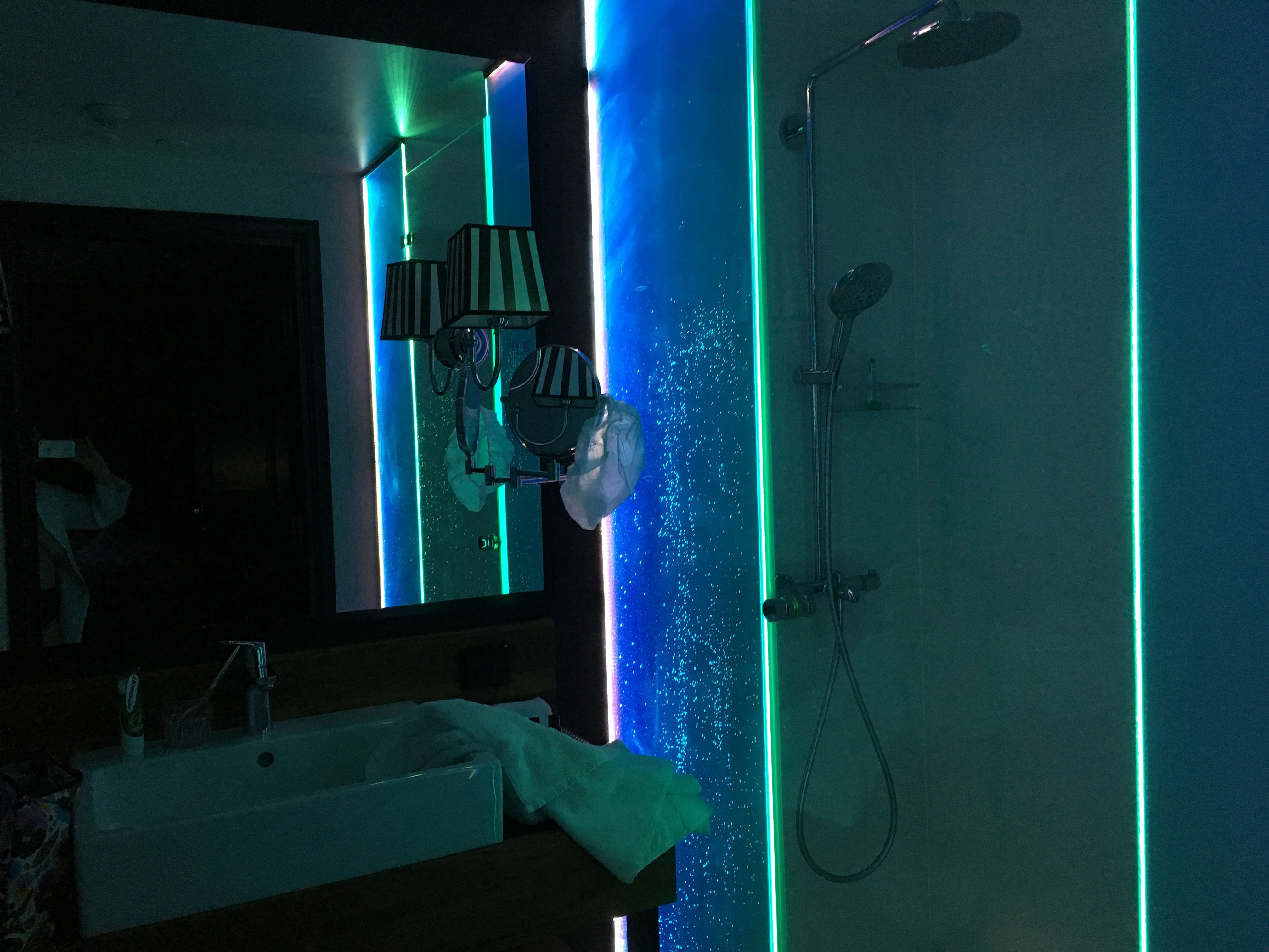 Huoneesta löytyy myös hauska keltainen divaani, taulutelkkari ja minibaari. Eteisessä on kaappitilaa ja nojatuolit. Kylpyhuone on siisti ja suihkupäitä on kaksi, tavallinen ja kattoon asennettu sadesuihku. Erityisesti plussaa siitä, että huoneessa on kaksi kokovartalopeiliä!