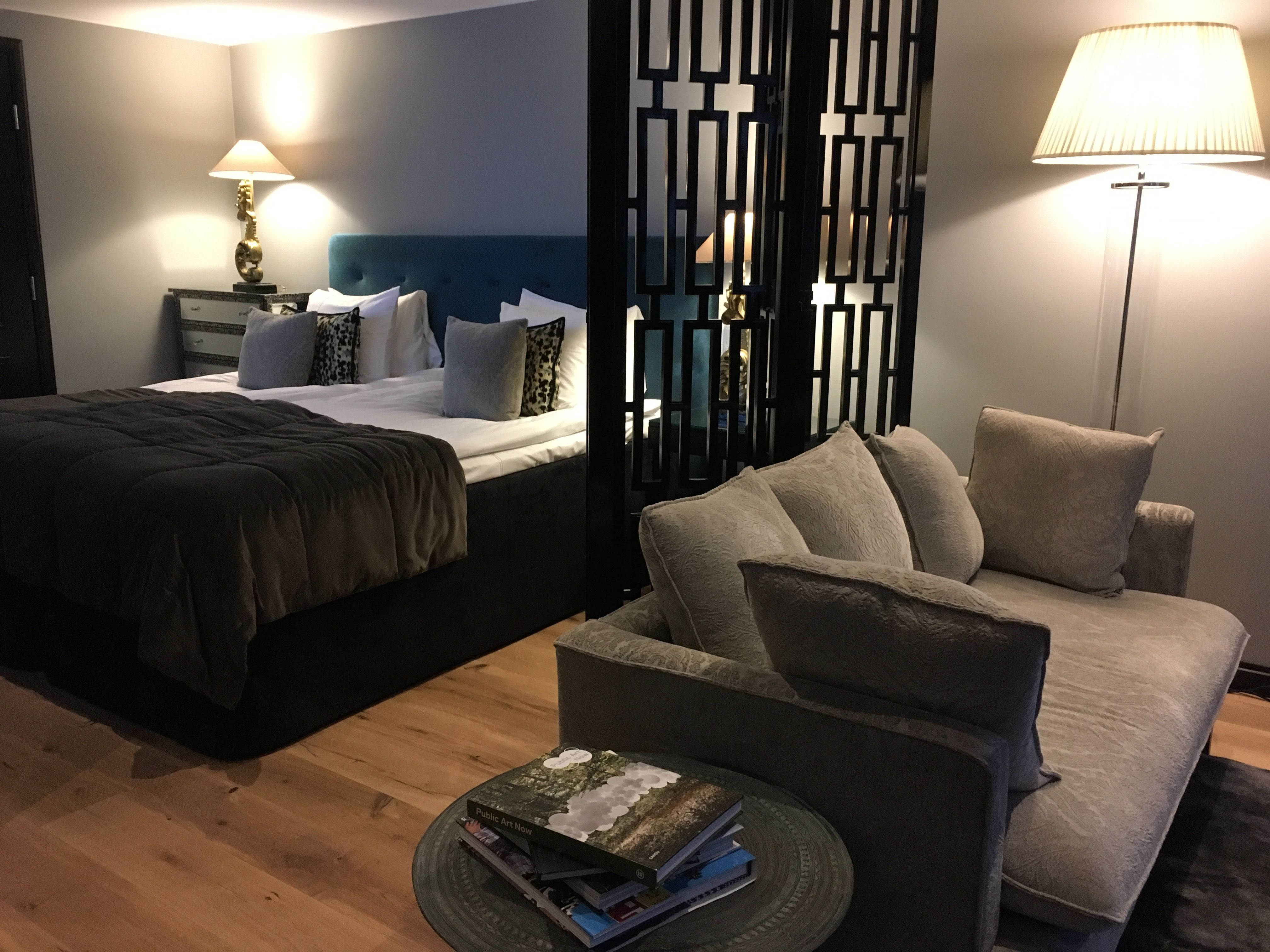 Testattavana ollut de luxe -huone on muhkeasti 45-neliöinen. Tummaa yleisvaikutelmaa – valoverhotkin ovat mustat – pehmentävät kodikkaat tuolit ja sohva sekä kaunis puulattia.