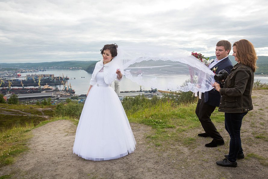 Venäjällä hääparit kiertävät kuvattavina kotikaupunkinsa nähtävyyksillä. Murmanskissa tämä paikka on Aljosha-patsas. Hääparejakin seurueineen oli kaksikin. Seurasimme toista paria ja saimme Olga ja Vladimir Parshinista kuvan.