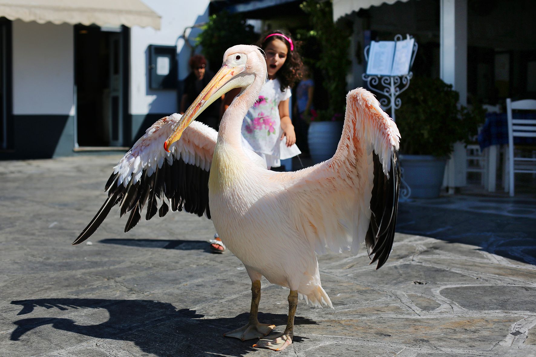 Markos-pelikaani on Tinoksen kalakauppiaan lemmikki, joka tepastelee vapaana kaupungilla ja satamassa joka aamu. Myös kalastajat saapuvat aamuisin satamaan saaliineen.
