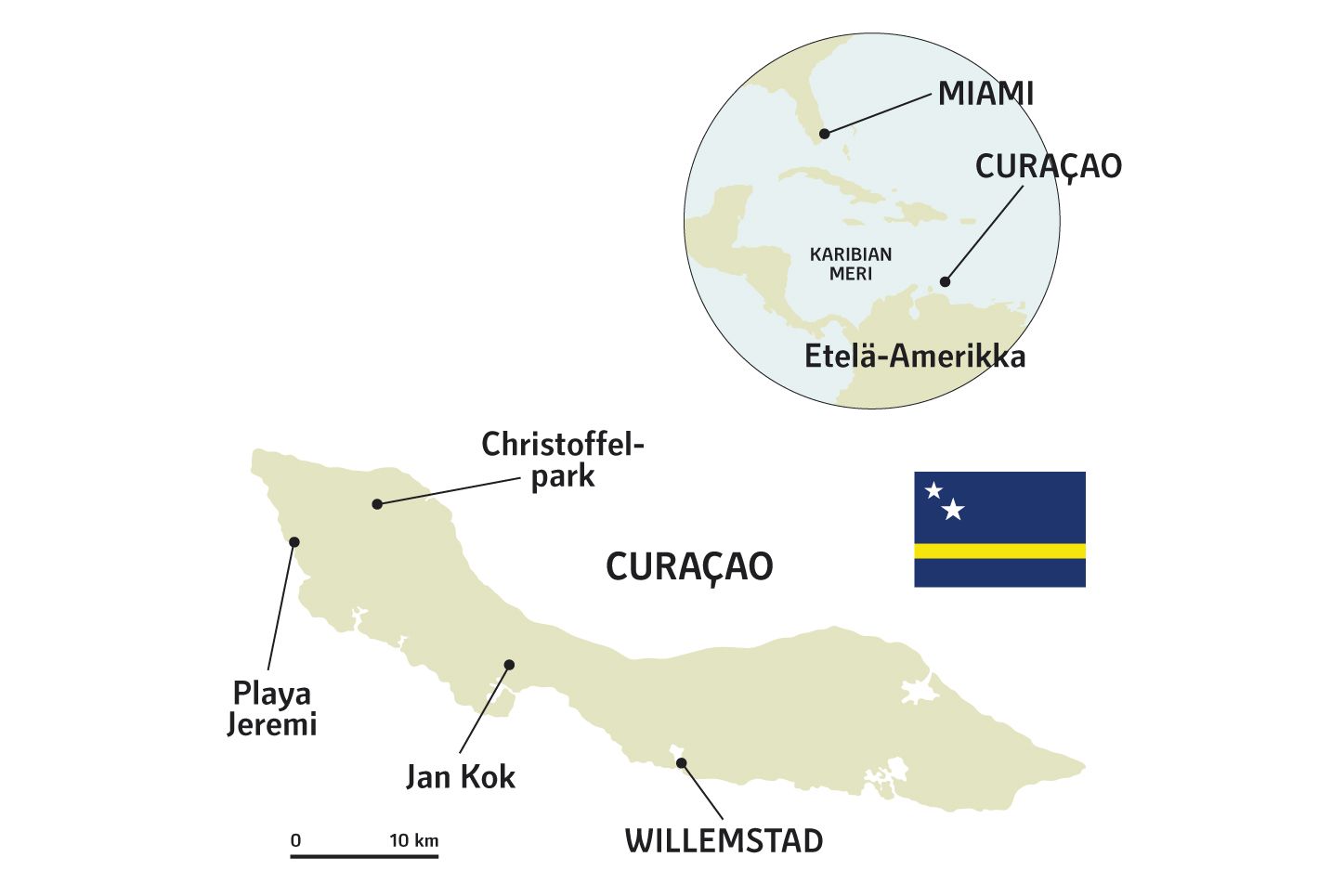 - Hollannin Antilleista (Aruba, Bonnaire, Curacao) suurin. Rantaviivaa 364 km.