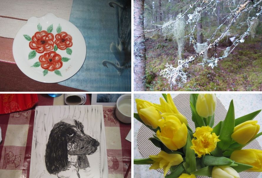 - ”Olin taas posliininmaalauksessa. Sain polttoon kaksi mukia ja kauniin pienen maljan. Kotiin toin valmiin kukkalautasen. ”