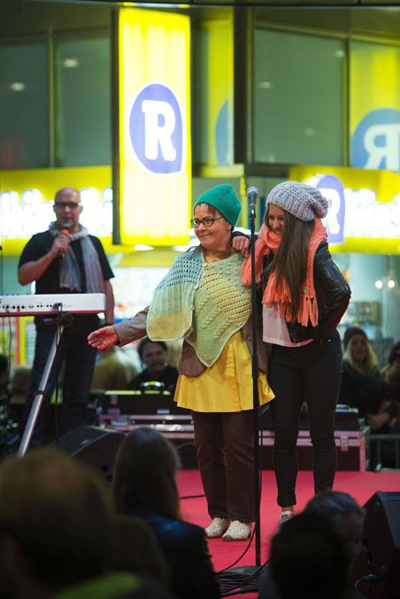– Esiintynyt olen ennenkin, mutta en ole koskaan ennen neulonut, nyt olen käynyt täällä kolme kertaa, eiköhän se kaulaliina vielä valmistu, hän uskoo.