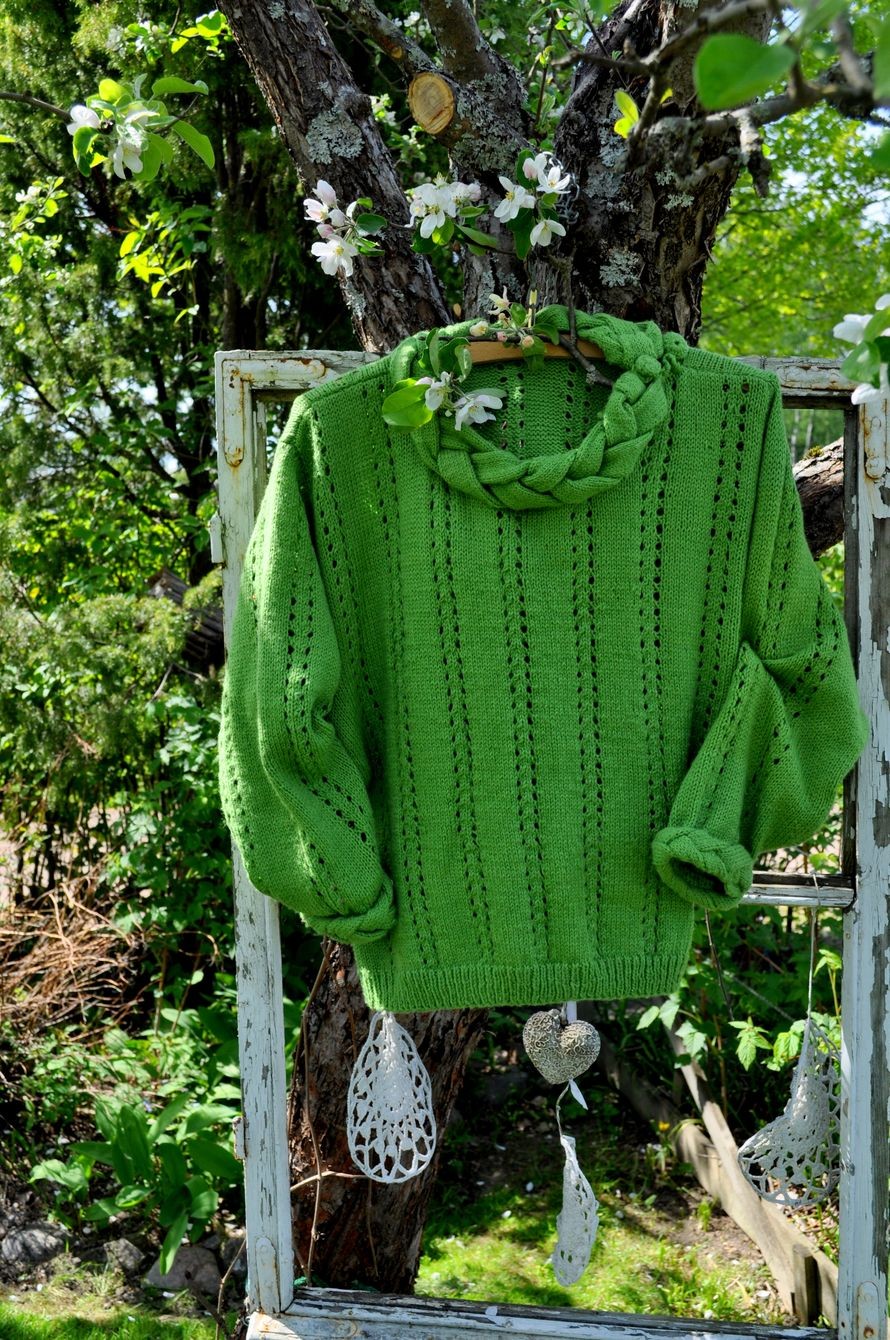 Tämän työn nimi voisi olla vaikka ”vihreä villapaita”. Tekijä kertoo kutoneensa pusero Fuengirolan talvikodissa Espanjassa. Kuva on selvästi otettu Suomessa.