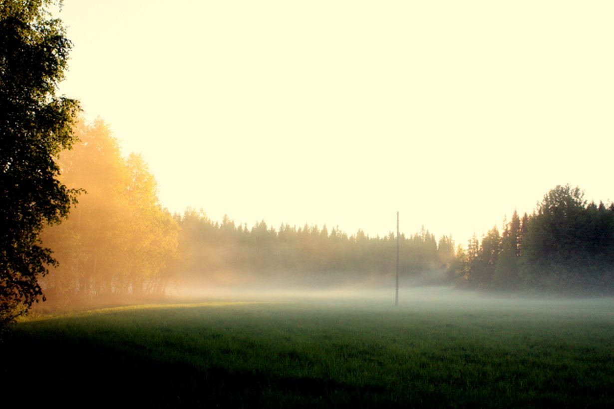 Auringon laskiessa usva leijuu pellolla ja aurinko värjää puut