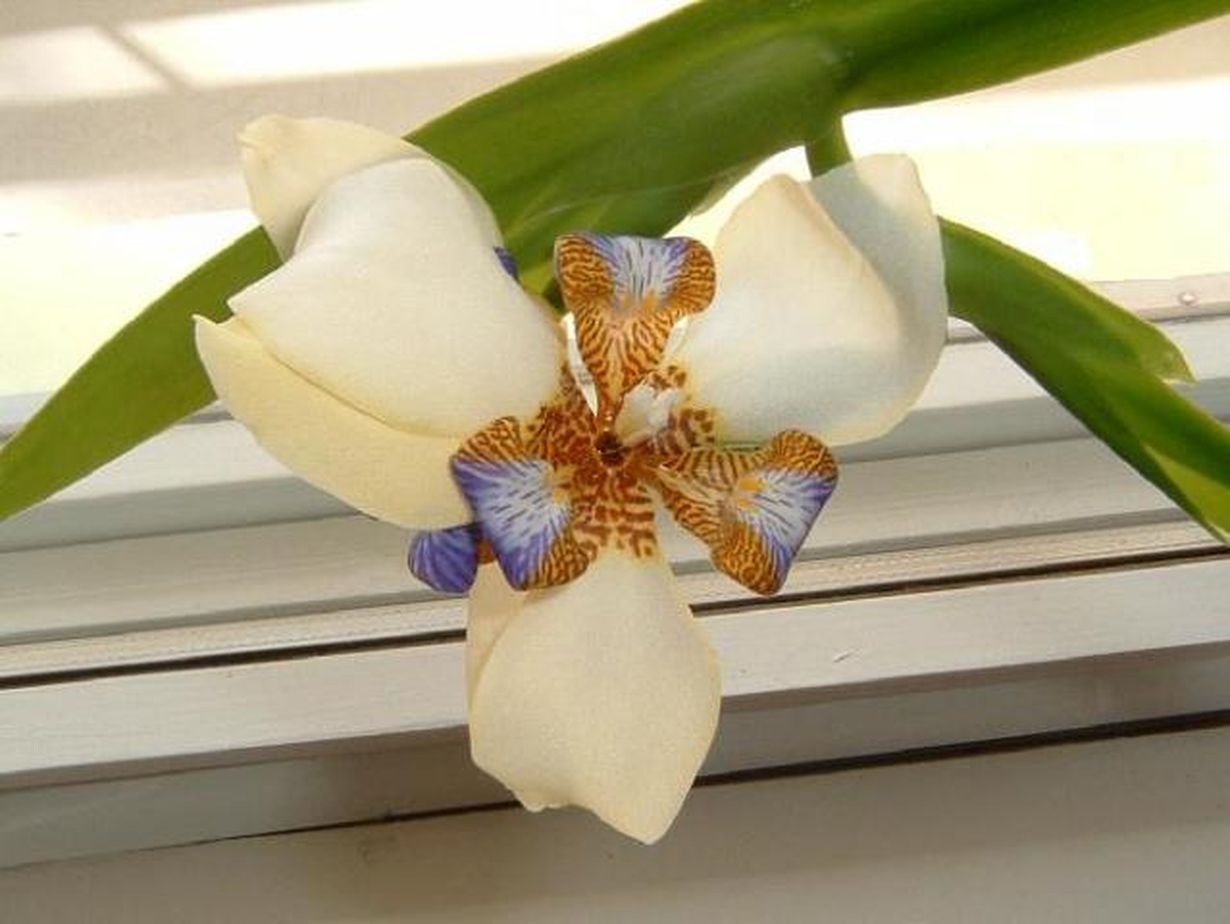 Tämä minun Apostolinmiekkani kukki tänä keväänä kun oli n. 2 vuotias ensimmäisen kerran ja kukka kesti silloin muutaman tunnin. Tässä kuvassa on kaksi nuppua avautunut lähes päällekkäin.
