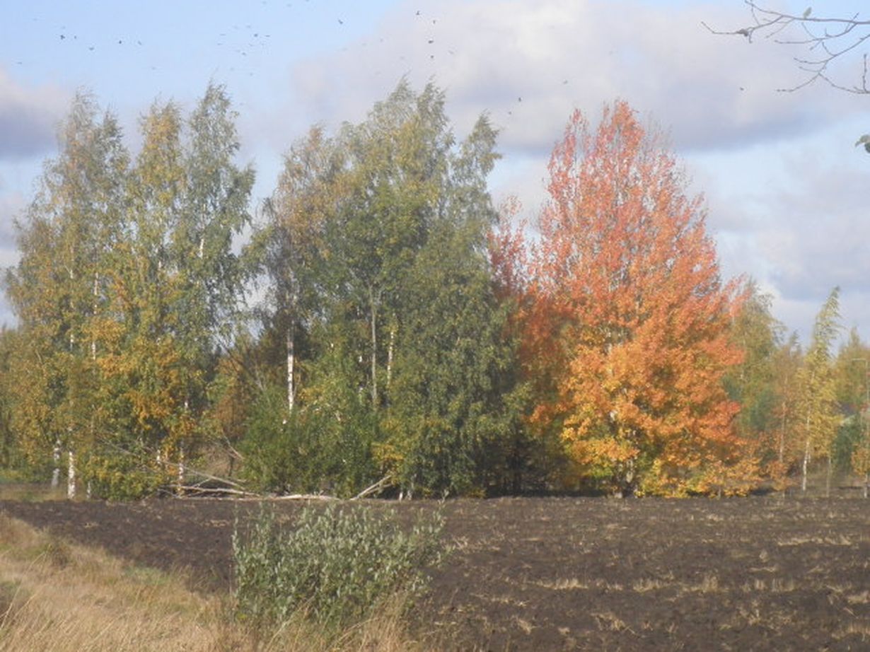 Haapa on ihana syyspuu, sen värit vaihtelevat vihreästä sitruunan keltaiseen ja oranssista punaiseen. Kontrastina maalta tuoksuva kyntöpelto.