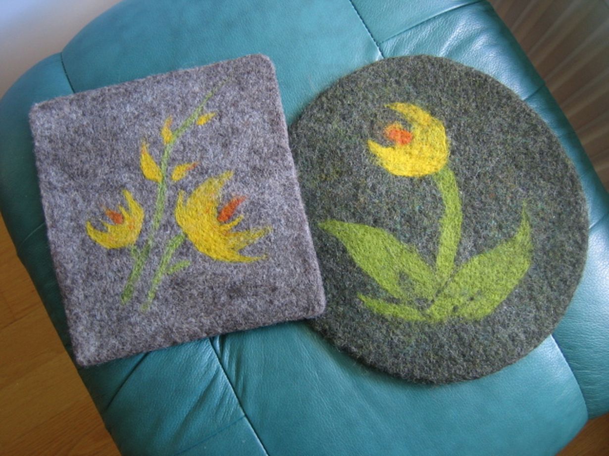 Villahahtuvasta olen ensiksi märkähuovuttanut pannunalusten pohjat. Kuivuttuaan viimeistelin ja koristekuvioin ne huovutusneulalla "vapaalla kädellä".