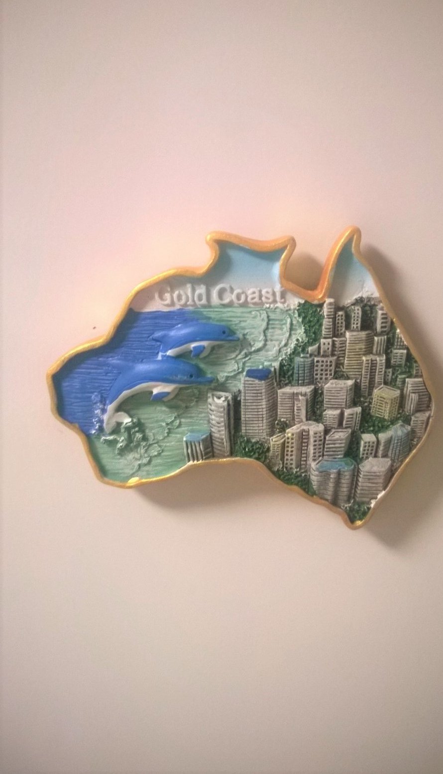 Olimme vaimon kanssa tutustumassa elo-lokakuussa 2016 Australian "lopputalveen ja alkukevääseen" mm. Queenslandin Cold Coastilla. Matkamuistomyymälästä tuli tuliaisena jääkaapin oveen keramiikasta tehty kaksiulotteinen magneetti, joka kuvaa hyvin suositun rantakohteen korkeita tornitaloja, runsaita hiekkarantoja ja merta, jossa delfiinit viihtyvät. Austaralian kartta on sinällään suosittu aihe paikallisissa matkamuistomyymälöissä jo sopivan muotonsa vuoksi.