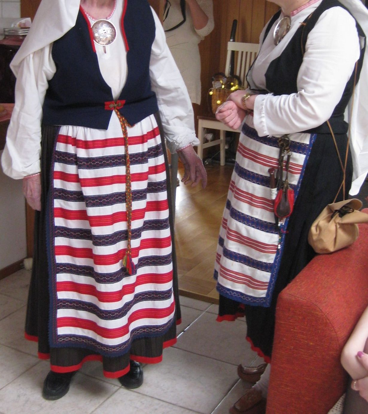 Vasemmalla Ruokolahden, oikealla Jääsken puku. Minulla on Jääsken puku ollut yli 40 vuotta, käyttöä on ollut aika paljon, rippijuhlissa, ristiäisissä ja häissä. Kun huntu peittää pään, ei ole huolta hiusten laittamisesta. Kansallispuvun kanssa ei ole juhlien pukeutumisessa miettimistä.