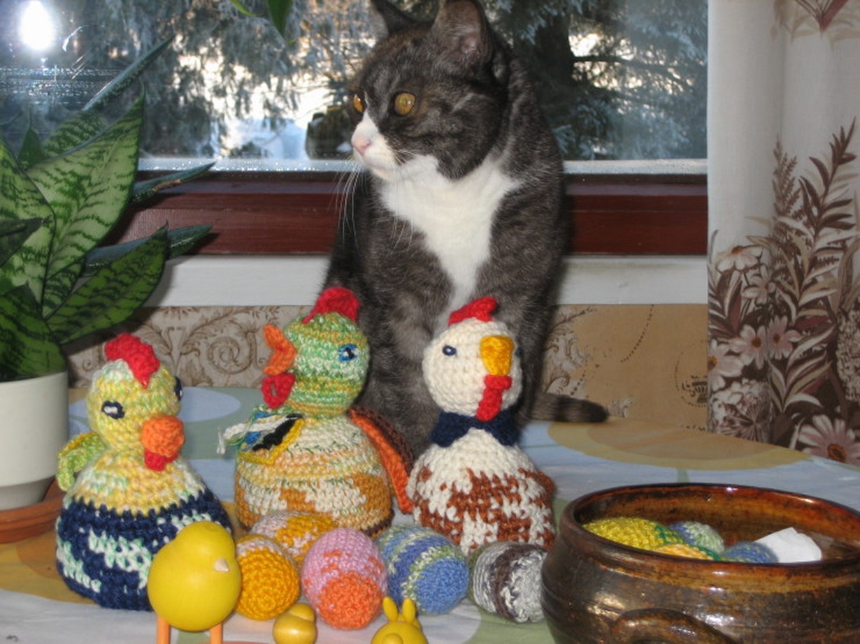 Olin kerännyt pieniä lankakeriä, joista kudon joskus jotain. Sain ideanpoikasen ehkä jonkin kuvavinkin pohjalta virkata pääsiäisaiheisia koristeita talvella 2013.Niistä sai iloa naapuritkin ja oman tyttären perhe.