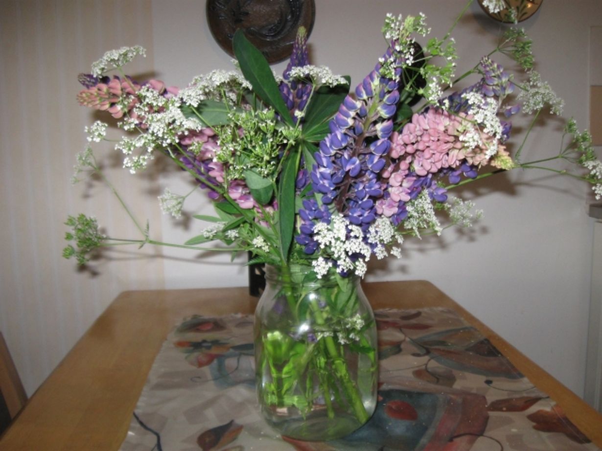 Nyt taas tuli tilaisuus poimia kukkia.Tilanne vaan on muuttunut niin,että asun nykyisin yksin kerrostaloasunnossa.Nyt piti laittaa kukat vähän pienempään purkkiin ja sijoittaa kimppu keittiön pöydälle