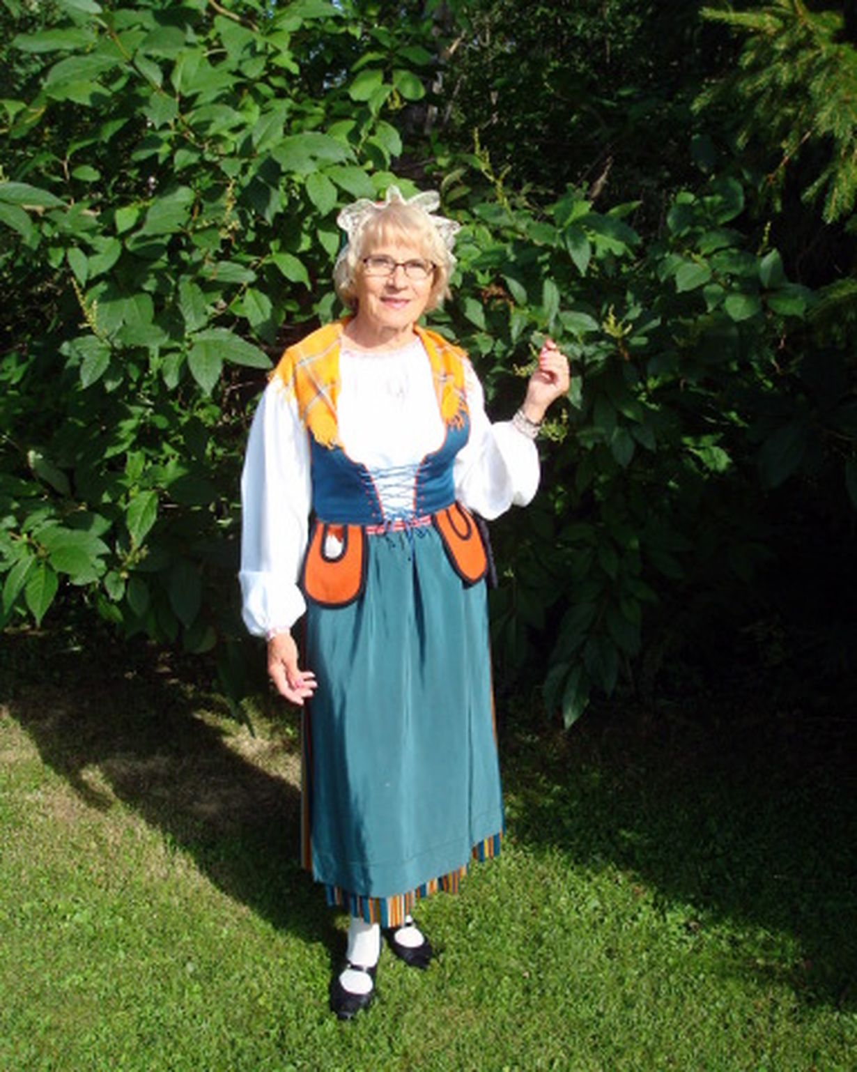 Pukuni on peräpohjolan kansallispuku. Puku on melkein 80 vuotta vanha. Sain sen perintönä 25 vuotta sitten mieheni vanhimmalta tädiltä. Puvun hän on ommellut itse. Puseroita on kaksi, toinen itse tehty, itse kudotusta kankaasta. Kuvassa oleva pusero, joka minulla on ylläni, on tilattu Vuorelmalta.