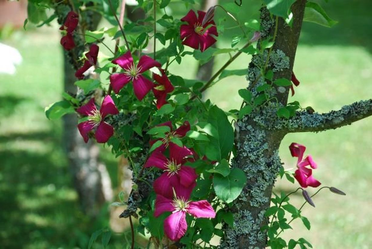 Viime kesän onnistunut yhdistelmä, kärhö kasvamassa omenapuun runkoa pitkin.
