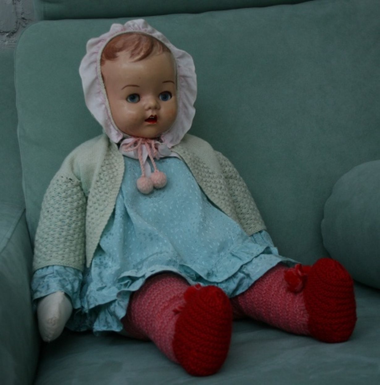 Tämä nukke on äitini minulle tekemä ja ikää sillä on yli 60 v. Ainoastaan pää on ostettu. Myös kaikki nuo vaatteet ovat alkuperäiset ja äitini tekemät. Nukke istui sängyn päällä koristeena, ei sillä juurikaan leikitty vaan huonommat nuket oli leikeissä mukana. Siksi se onkin säästynyt niin kauniina.