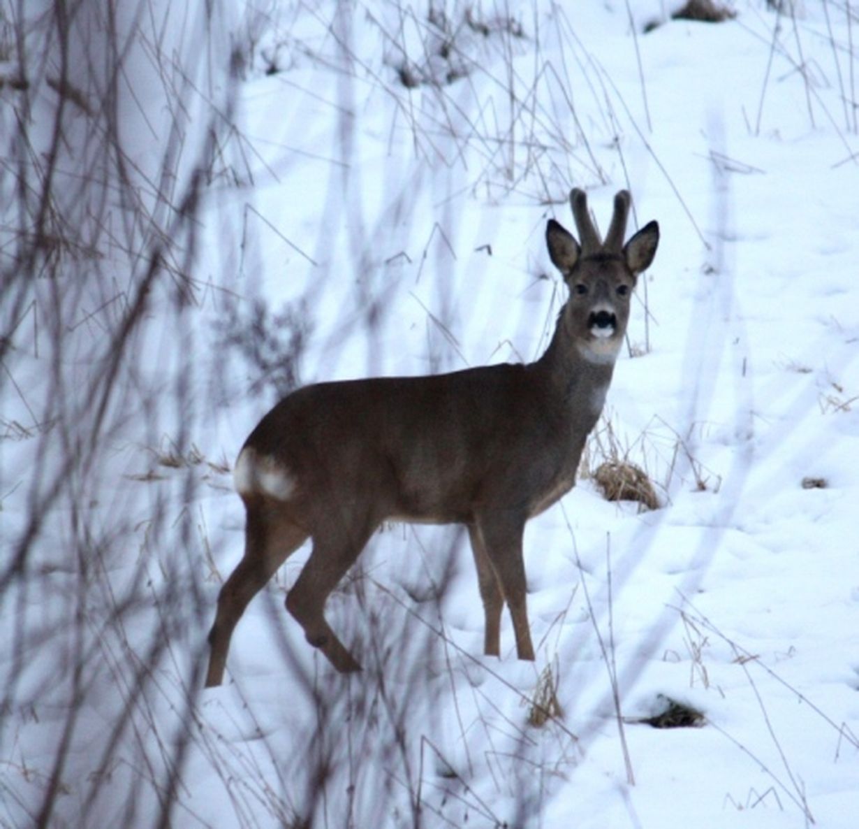 Ruokin lintuja, kauriita, rusakoita ja hiirulaisia, myös myyriä käynee ruokintapaikoillamme jälkiistä päätellen. Ruokinnallamme kävi pikkupukin lisäksi ilokseni uljas Ykäpukkikin pitkästä aikaa, joka aterioi ensin harakoiden kanssa. Lähdettyään pois takapihan ruokinnalta sain napattua Ykästä tällaisen kuva kuvan.