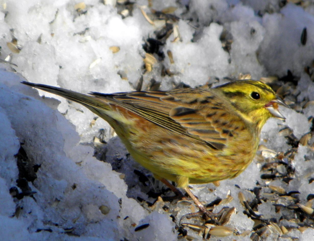 Keltasirkku etsii jyviä maasta lintulaudan alta