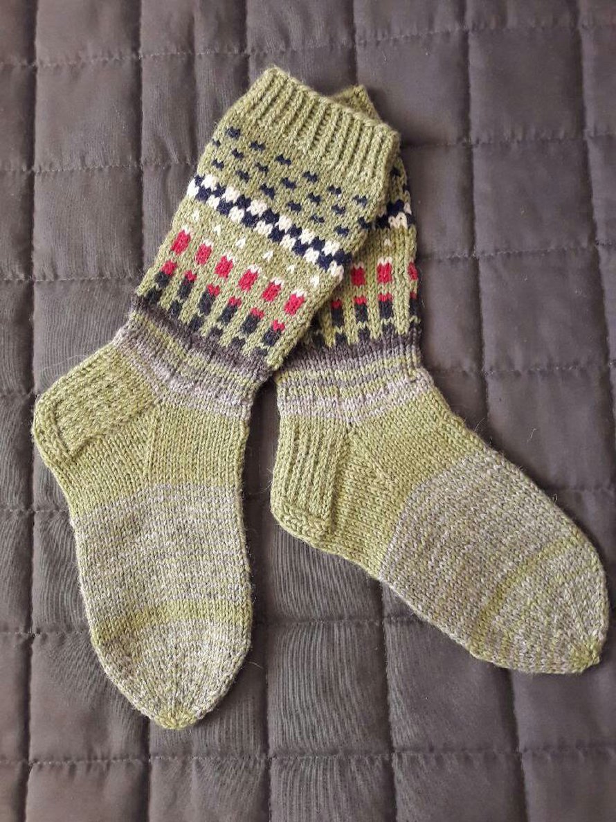 Kun oltiin lapsia ja tuli kesä, kuivuneen heinän tuoksu antoi turvallisen ja helpottuneen olon; heinät oli vihdoinkin saatu seipäiltä latoihin. Vieläkin tuo tuoksu rauhoittaa. Näissä harmaanvihreissä villasukissa kuvaan tunnelmaa tuntemattomalle ystävälle. Olen neulonut villasukkia työkavereille, sukulaisille ja ystäville. Nykyisin ne ovat usein muistoja lapsuudesta. Kuviointi ja värit syntyvät työn edetessä.