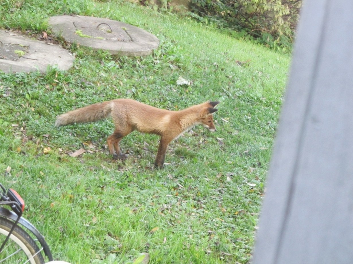 Olin hiljattain juomassa aamukahvia keittiön pöydän ääressä, kun huomasin vieraan pihassa. Otin kameran ja sain tämän kuvan, huomasin vielä että kettu hyppäsi jonkin kimppuun, varmaan hiiren. Yritin toista kuvaa ja siirryin, jolloin se livahti metsään. Olen nähnyt sen pihapiirissä sen jälkeenkin.