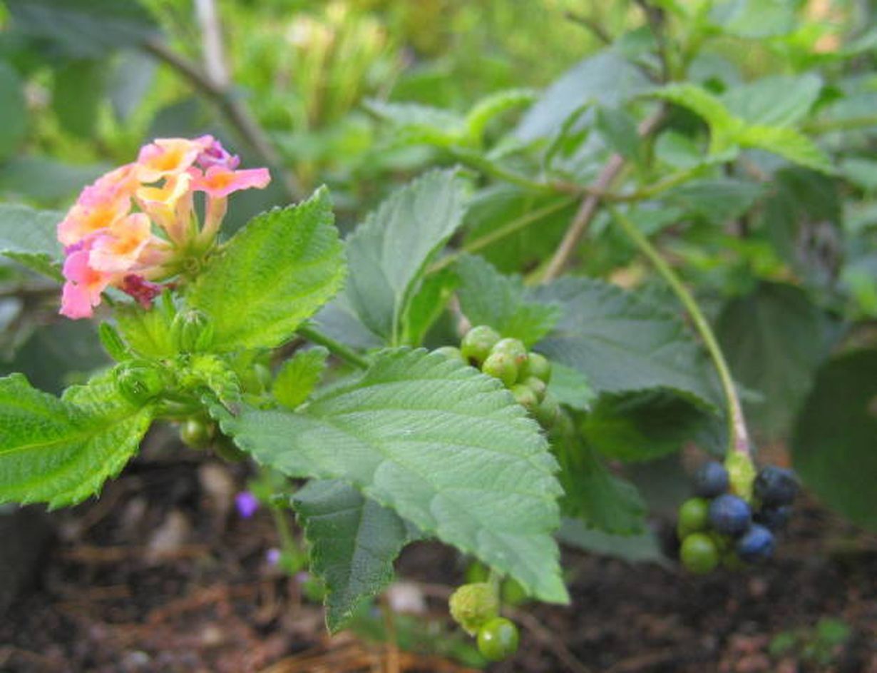 Vain syksyllä voi nähdä nämä kaikki yhdessä, kukat, vihreät marjat ja kypsät siniset marjat.