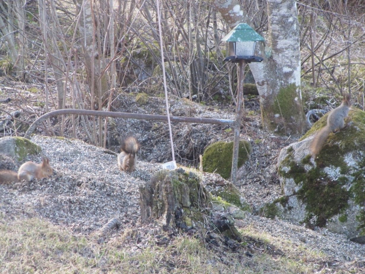 Lintulaudan alla on käynyt ruokailemassa talven aikana viisikin oravaa yhtaikaa, tässä vain kolme. Auringonkukan siemeniä on putoillut runsaasti maahan ja niitä käyvät hyödyntämässä oravien lisäksi tikka ja pari harakkaa. Ja tietysti lukematon määrä pikkulintuja.