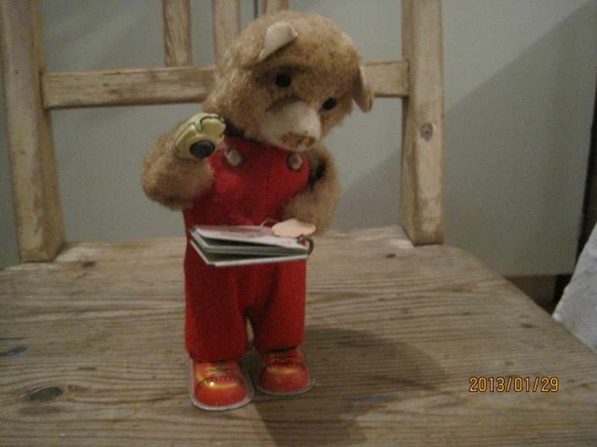Vieterillä vedettävä peltinalle joka kääntää kirjan sivuja. Sain nallen mummoltani kun olin n. 5 vuotias. Minun lisäkseni lelulla on leikkinyt tyttäreni. Nyt lelu odottaa kaapin päällä lapsenlapsia.