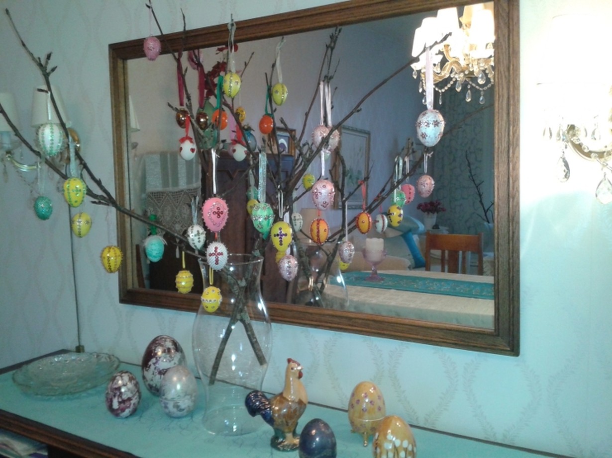 Anja Hyyryläisen itse askartelemat pääsiäismunat ja kukko. Okasassa roikkuvat munat ovat styroks-munia baljetein ja helmin koristeltu. Posliininmaalaus kerhossa maalatut pöytämunat ja kukko. Eläkeläisen harrastus omaksi iloksi ja ajankuluksi sekä oman kodin kaunistuksesksi.