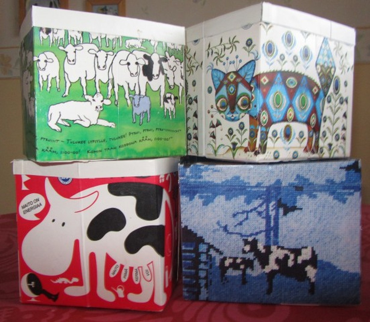 Lukijoiden kuvat: Wau, mitä käsitöitä! Maitotölkit 5.1.2012 klo 20:39 Hienot desing-tölkit uusiokäyttöön, tukeviksi "laatikoiksi".