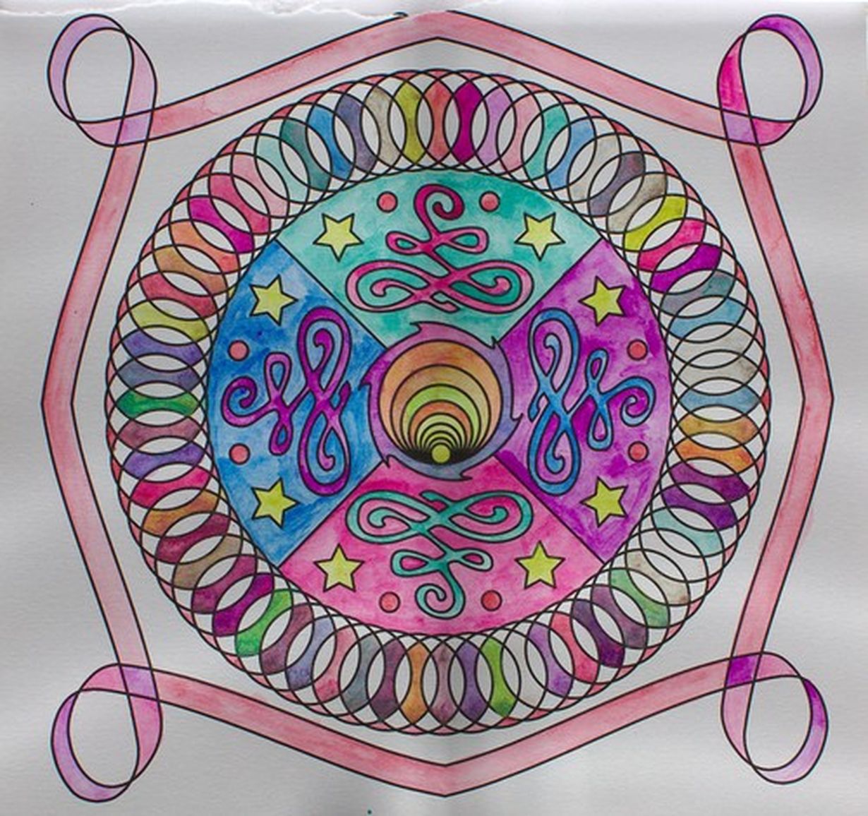 Näin me väritetään! Mandala 8.9.2015 klo 16:36 Tämä oli ensimmäinen kokeilu lahjaksi saaduilla Derwentin metallinhohtoisilla vesiliukoisilla puuvärikynillä.
