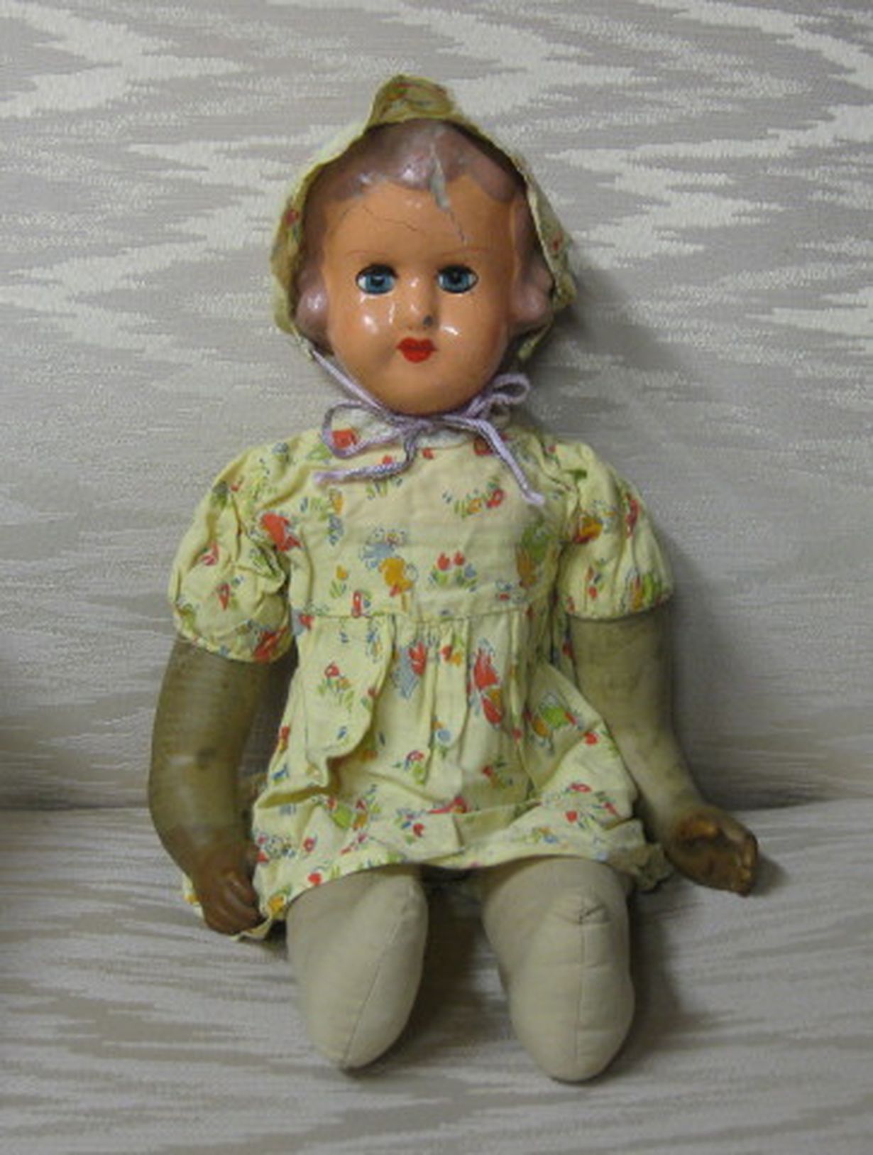 Nukella oli kaunis keltainen tukka jostain pumulimaisesta aineesta. Vaatteet ovat alkuperäiset. Nuket kumikädet ovat tummuneet ja jalat vallan vaihdettu uudiin. Sillä on leikitty kovasti, nykyisin se istuu kaapinpäällä vielä vanhempi nalle kaverinaan.