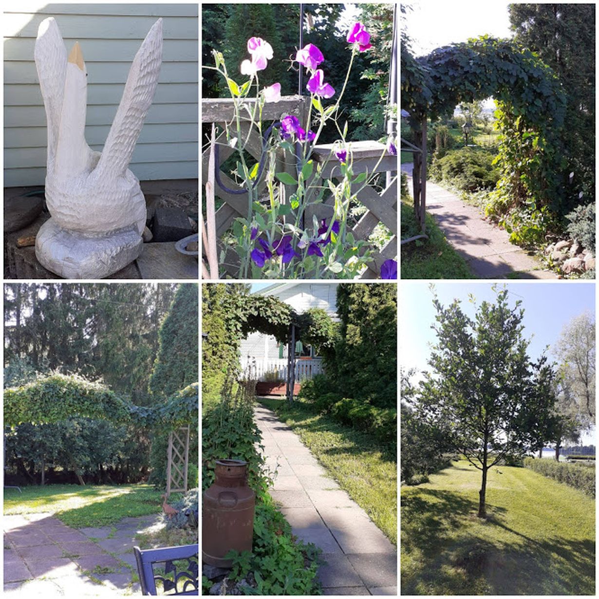 Mieheni toi Japanin humalan taimen jo 1990-luvulla puutarhamyymälästä ja käly toi tavallisen käpyhumalan Noormarkusta joskus 2000-luvun alussa. Japanin humallaa nimitetään myös morsiushunnuksi sen huntumaisten kukkien vuoksi. Humalista teimme humalaportit sekä alapihalle että pyykkipihalle. Nyt niistä on ollut suuri ilo jo useiden vuosien ajan. Pihani on pitkä ja laskeutuu Tuusulanjärven rantaan. Olen tavattoman onnellinen pihamaisemastani. Humalaportti on kuin TaruSormusten Herrasta ja antaa mielikuvitukselle vallan. Onnekseni asun maaseudulla, kävelymatkan päässä (2,6 km) keskustasta ja kuitenkin kaupungissa.