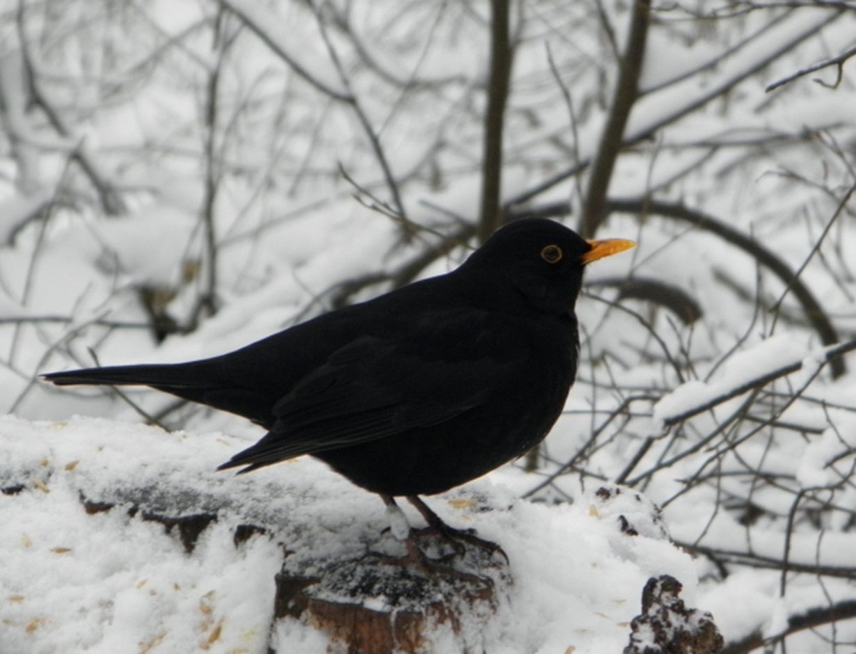 Ensilumi Mustaa valkoisella 19.1.2012 klo 15:12 Uusi lumi ja mustarastas, jälkimmäinen siinä edukseen.