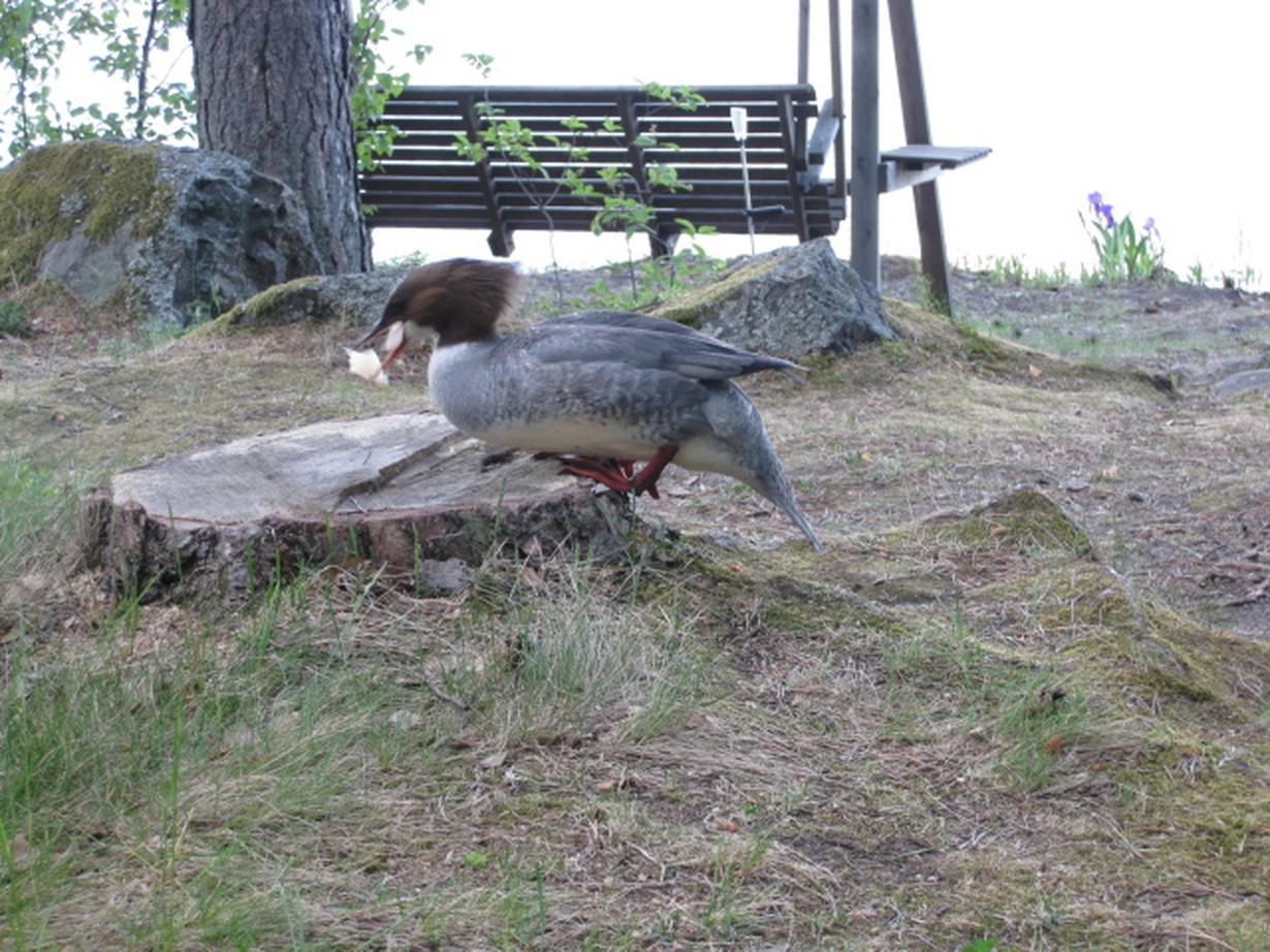 Koskelo käveli rannasta suoraan luokseni mökin pihaan ja oli hätääntyneen oloinen. Koskaan ennen koskelo ei ole tullut pihaan, joten arvelin sillä olevan jokin hätä. Illalla olin fileerannut hauen ja hain yhden fileen jääkaapista ja paloittelin sen sille. Se ahmi sen lähes kokonaan nopeasti ja lähti pikaisesti järveen takaisin.