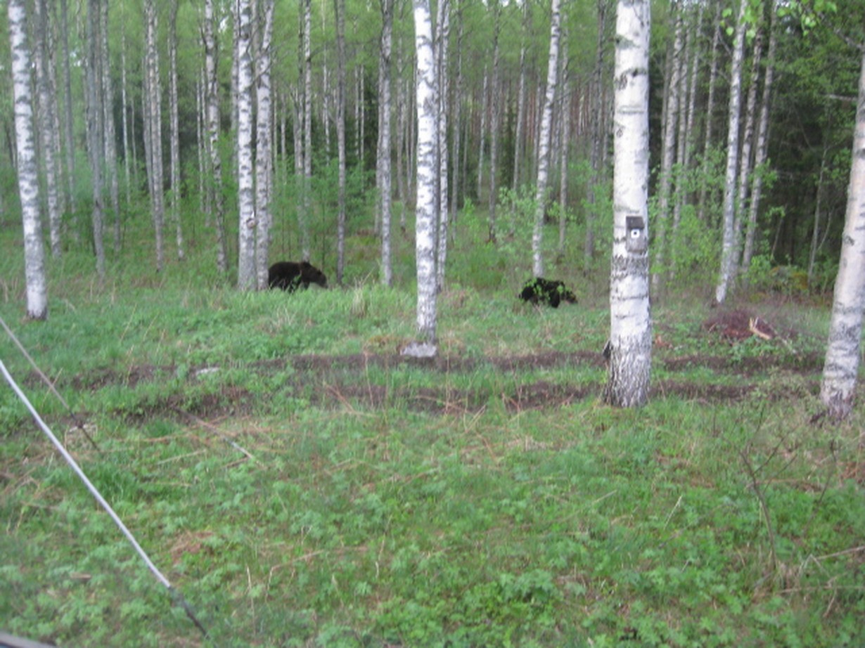 Kuva on otettu Tyrjän kylässä (Ilomantsissa) sijaitsevan mökkimme tuvan ikkunasta toukokuun 26.5.2011 klo 20 aikoihin. He kulkivat rauhallisesti omia polkujaan ja toisiaan haistellen...