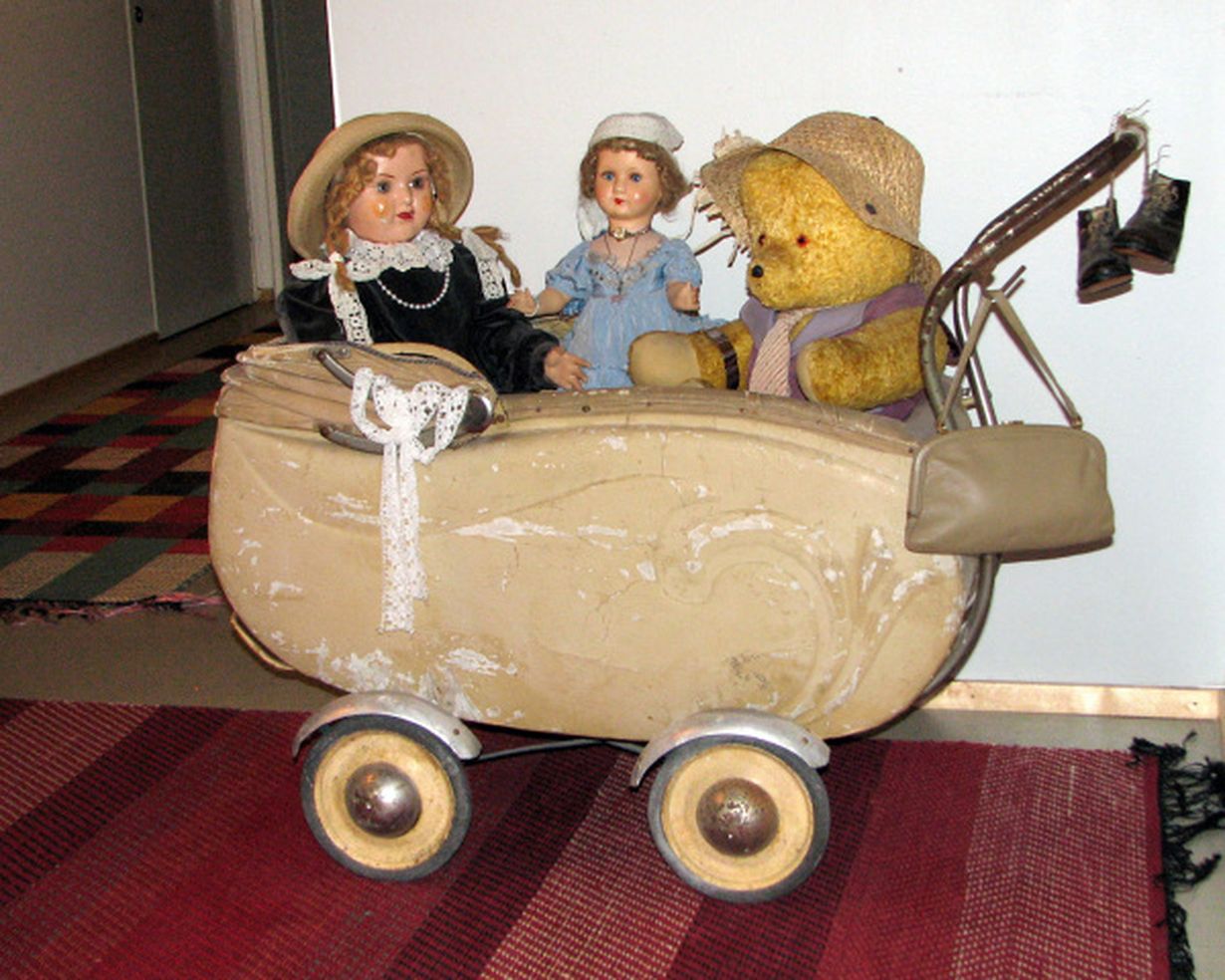 Eteisessäni tervehtii tulijaa 1940-luvun lastenvaunut. Vaunuissa istuu trio, lähes 60-vuotias Sylvester-nalleni sekä Elna- ja Mamma-nuket. Iso-äitini Vilhelmiina on ostanut nallen 1950-luvulla Tyynelän tavaratalosta Jyväskylästä. Nallen vieressä olevan Mamma-nuken olen saanut tuliaisina Ruotsista 1950-luvun alussa. Nukella on alkuperäinen mekko ja sen hienouksiin kuului sanoa "mamma". Isompi Elna-nukke on 1920-luvun saksalainen. Se on lojunut pari vuosikymmentä navetan vintillä. Pelastin sen hämeenlinnalaisesta Pekan Antiikista ja ostin sille 1930-luvun samettimekon ja lierihatun. Lettinauhoina sillä on Hilja-mummon virkkaamat pitsit.