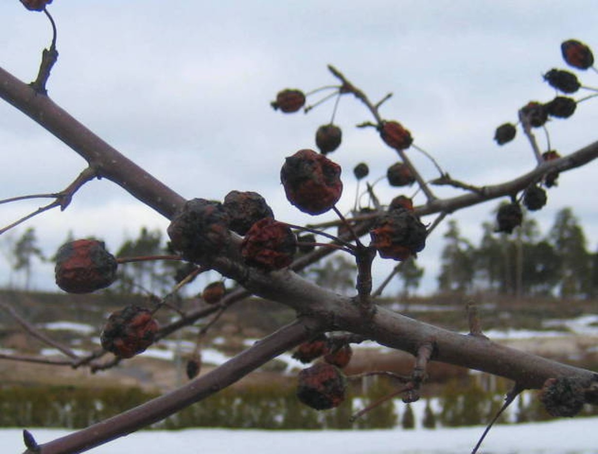 Enemmin kuin lunta, näkyy jo paljasta maata täällä etelärannikon virkistysalueella 30. 3.. Jotakin kurttuisia marjaomenan näköisiä siinä oksissa.
