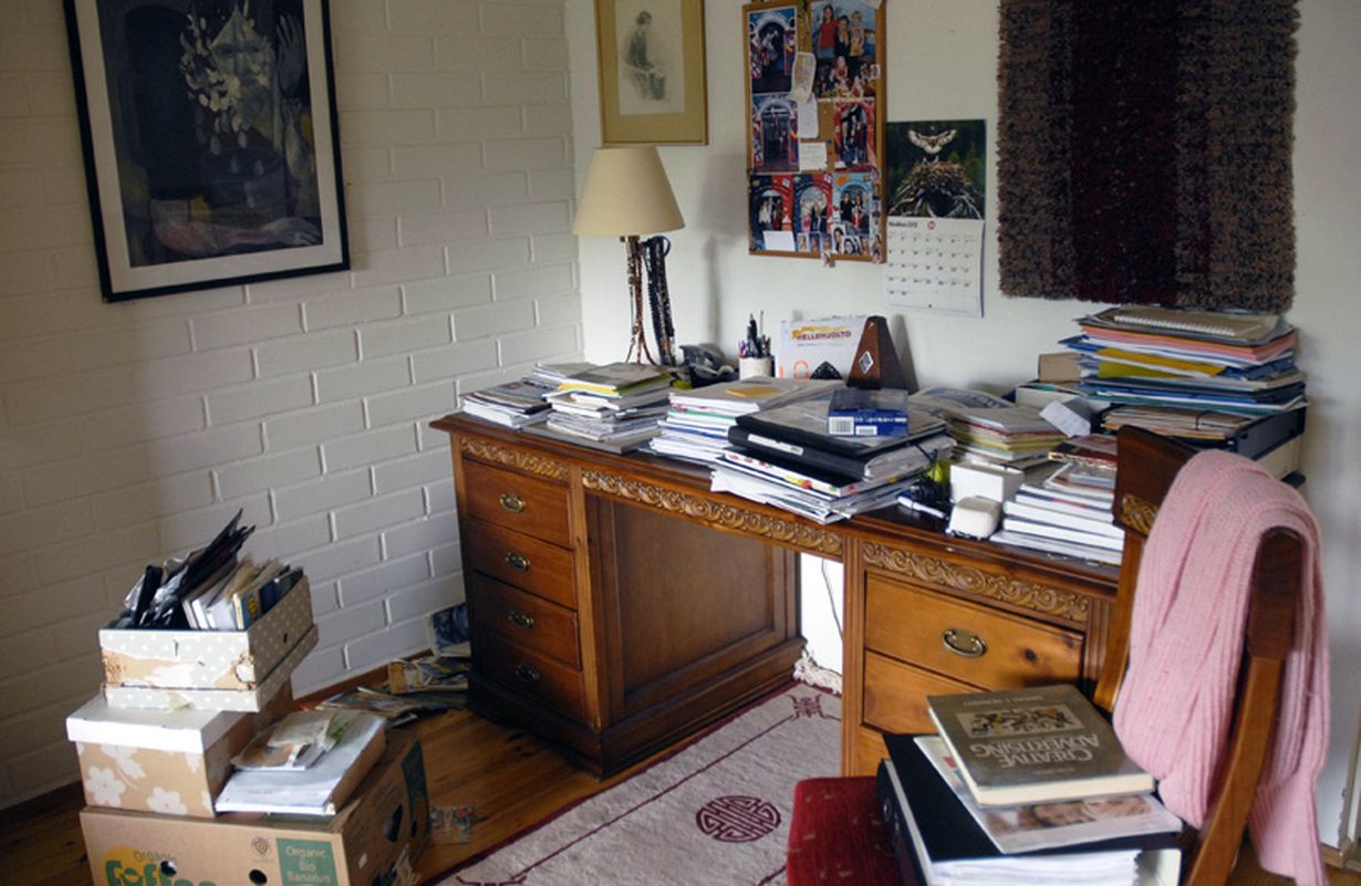 Työhön liittyvää tavaraa kansioista kirjoihin ja muistiinpanolehtiöistä valokuvakansioihin on asettunut kirjoituspöydälle ja ympäristöön niin paljon, että ei siihen enää mahdu töitä tekemään. Siivous ei ole päässyt käyntiin: en raaski heittää pois mitään!