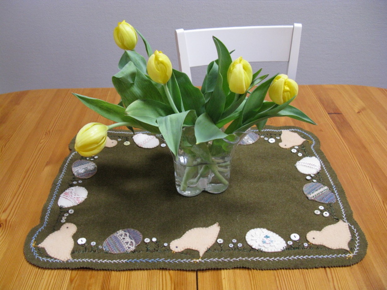 Amerikkalainen ystäväni on luova ja kekseliäs. Hän lähetti minulle lahjaksi tekemänsä liinan, jossa on huopa-alustalle ommeltu huopatipuja ja munia. Ne on koristeltu hauskasti koruompeleilla, napeilla, helmillä, pitseillä ja nauhoilla.
