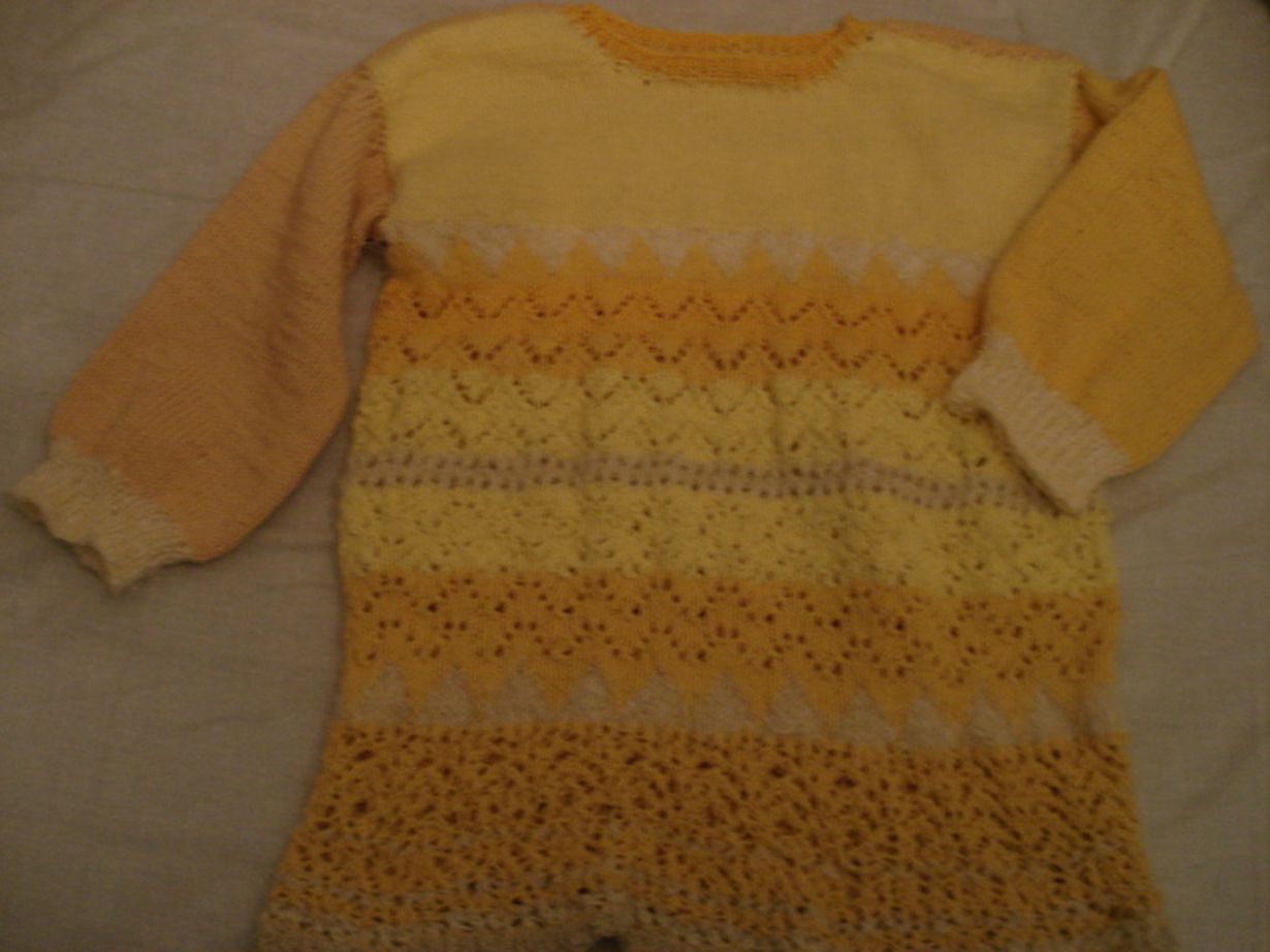 Kudoin tätä kauan, kun aluksi tein liian pienen ja piti aloittaa alusta. Perusidea on vanhasta Suuri Käsityökerho -lehdestä, mutta yhdistelin siihen jotaim muuta mallia ja omia ideoita. Minulle kertyy monenlaisia lankoja, tässä oli tavoite käyttää tytön lempiväriä keltaista. Jossain vaiheessa piti hankkia hiukan lisää lankaa, lopulta sitä jäi yli niin paljon, ettei varasto köytynyt kuin muutamalla kerällä. Neuleisiini sisältyy muistoja, tätä on esimerkiksi kudottu kesälomamatkalla, Pesäkarhujen risteilyllä - ja lopulta rakkaan tädin vuoteen äärellä saattohoidossa.