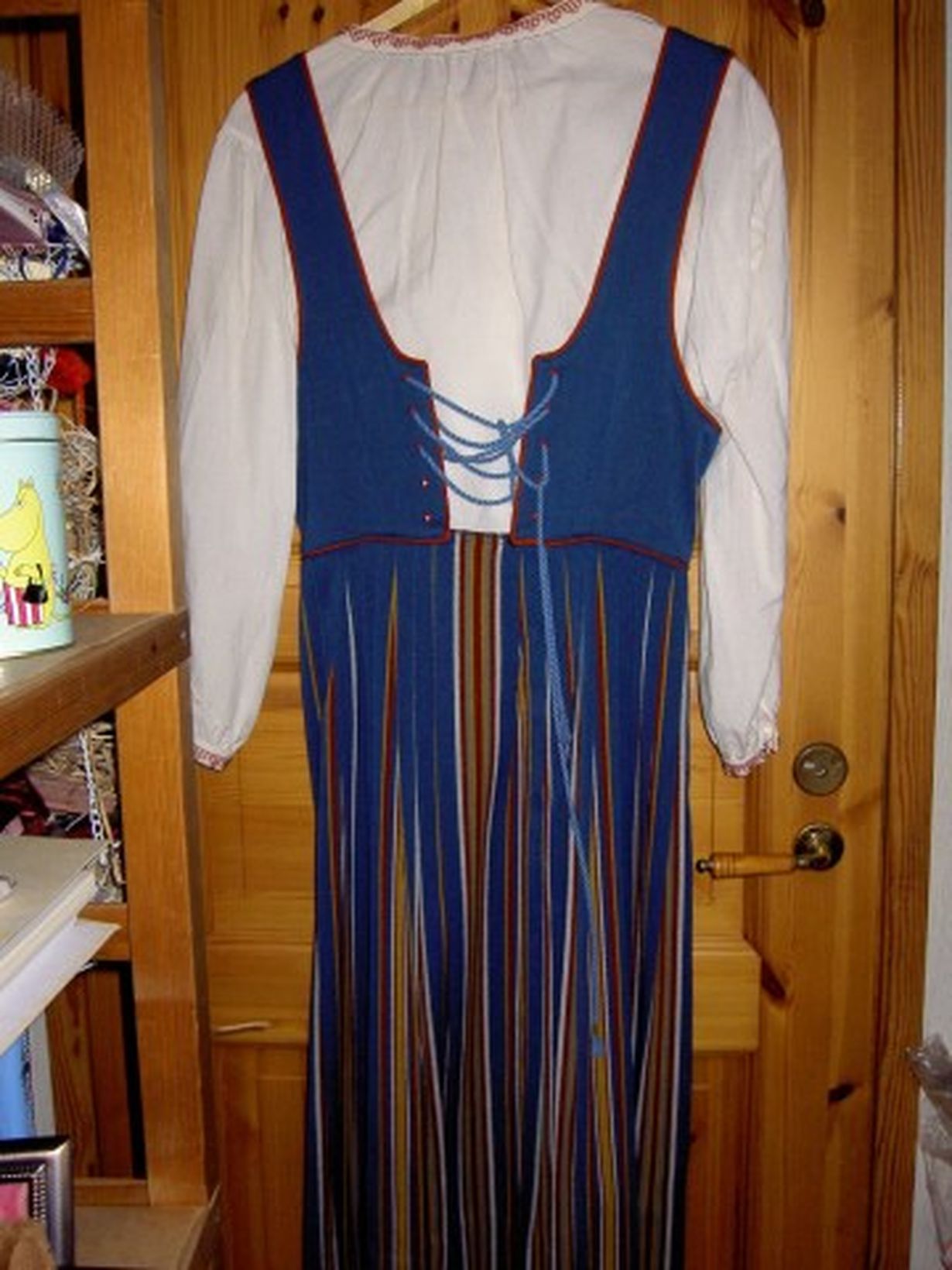 Pukuni sain vuonna 1980, 21-vuotiaana. Nyt jo edesmennyt mummoni päätti, että minulle pitää ehdottomasti hankkia kansallispuku, vaikka mitään varsinaista syytä siihen ei ollut, en harrastanut tanhuamista tai soittamista. Puku siis kuitenkin tilattiin silloisten mittojeni mukan Vuorelmalta ja käytin sitä jonkun kerran sukulaisten syntymäpäiväjuhlissa.