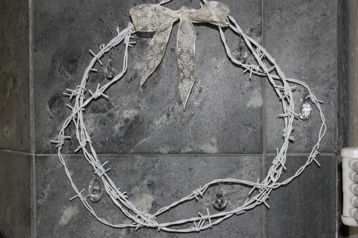Vanhasta ruosteisesta piikkilangasta saa kauniin karuja koristeita maalaamalla ne raikkaan valkoisiksi. Tässä kranssi, mutta myös sydämiksi taivutettuna siitä tulee kivoja koristeita!