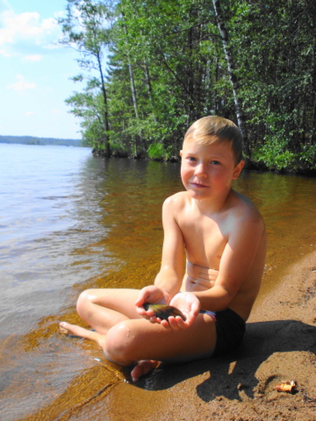 Elli Lönngren, 12v, kuvasi pikkuveljensä Linuksen Leivonmäen kansallispuistossa heinäkuussa 2011, kun tämä löysi elävän isojärvisimpukan. Se tietysti laskettiin takaisin veteen.