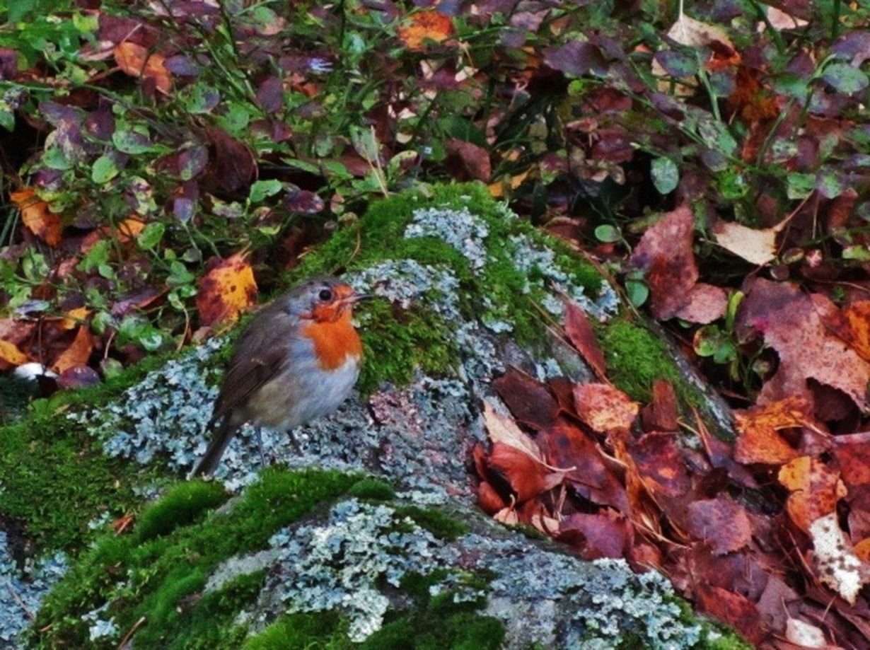 Punarinta syksyn lehtien keskellä.
