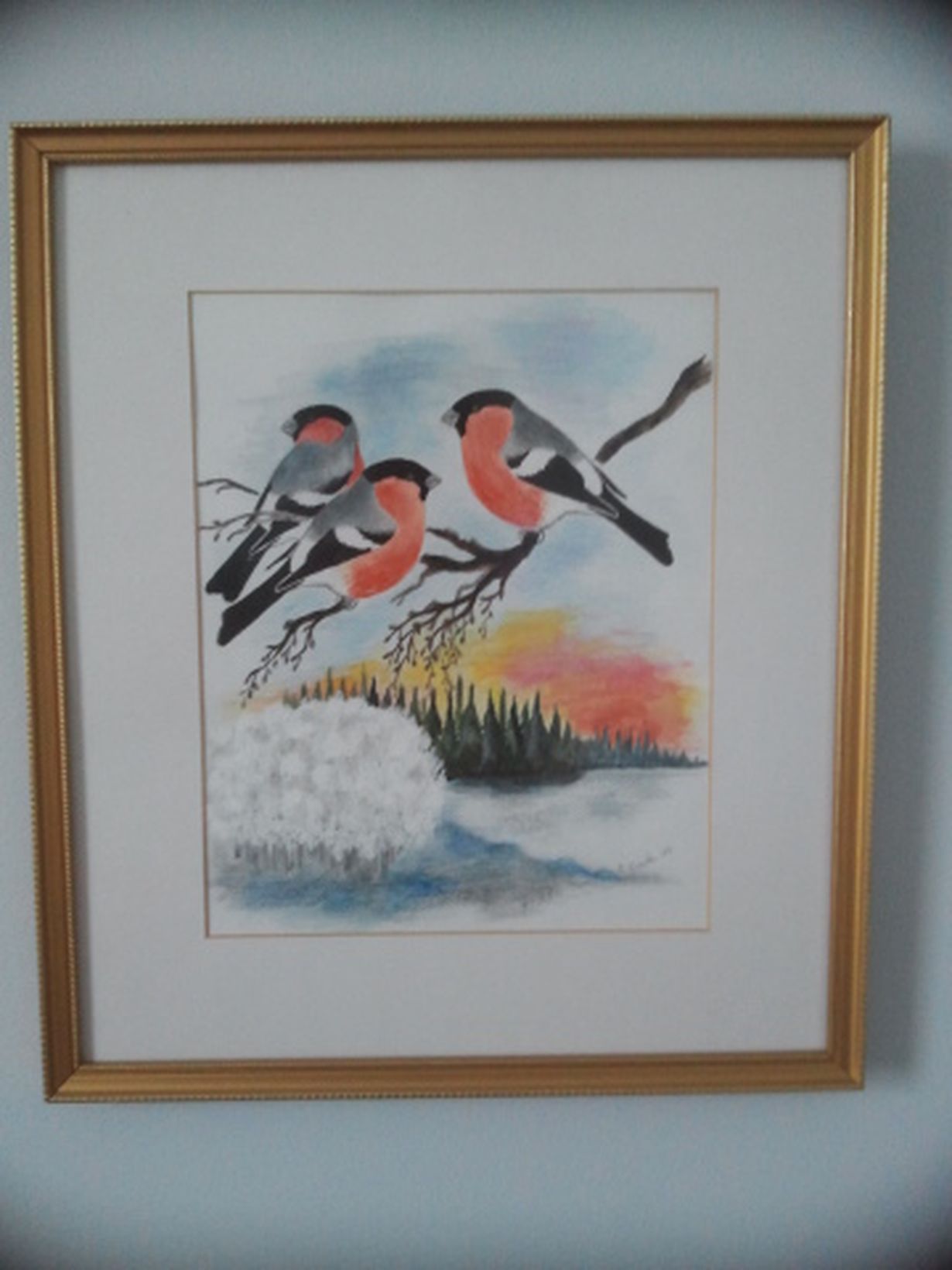 Lukijoiden kuvat: Wau, mitä käsitöitä! Punatulkut 26.1.2012 klo 11:44 Vesiväreillä maalattu talvimaisema