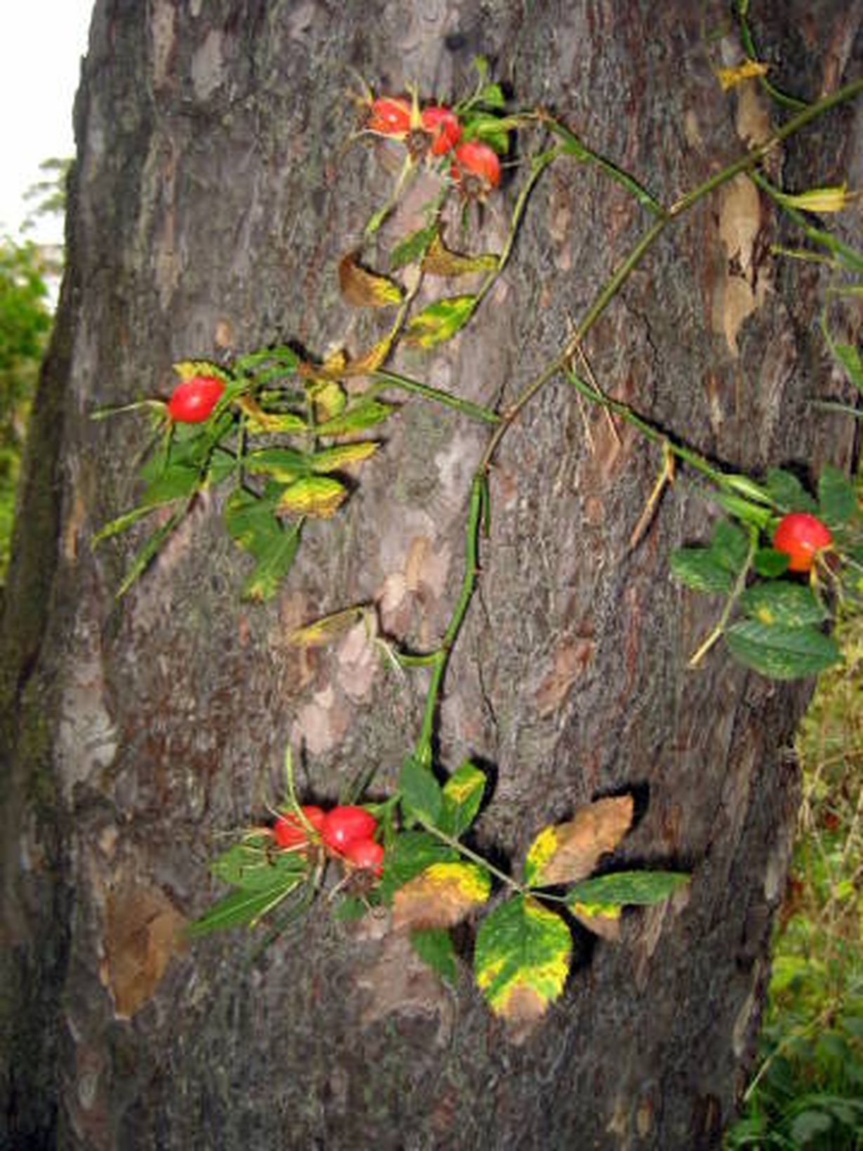 Villiruusu marjoineen männyn runkoa vasten.