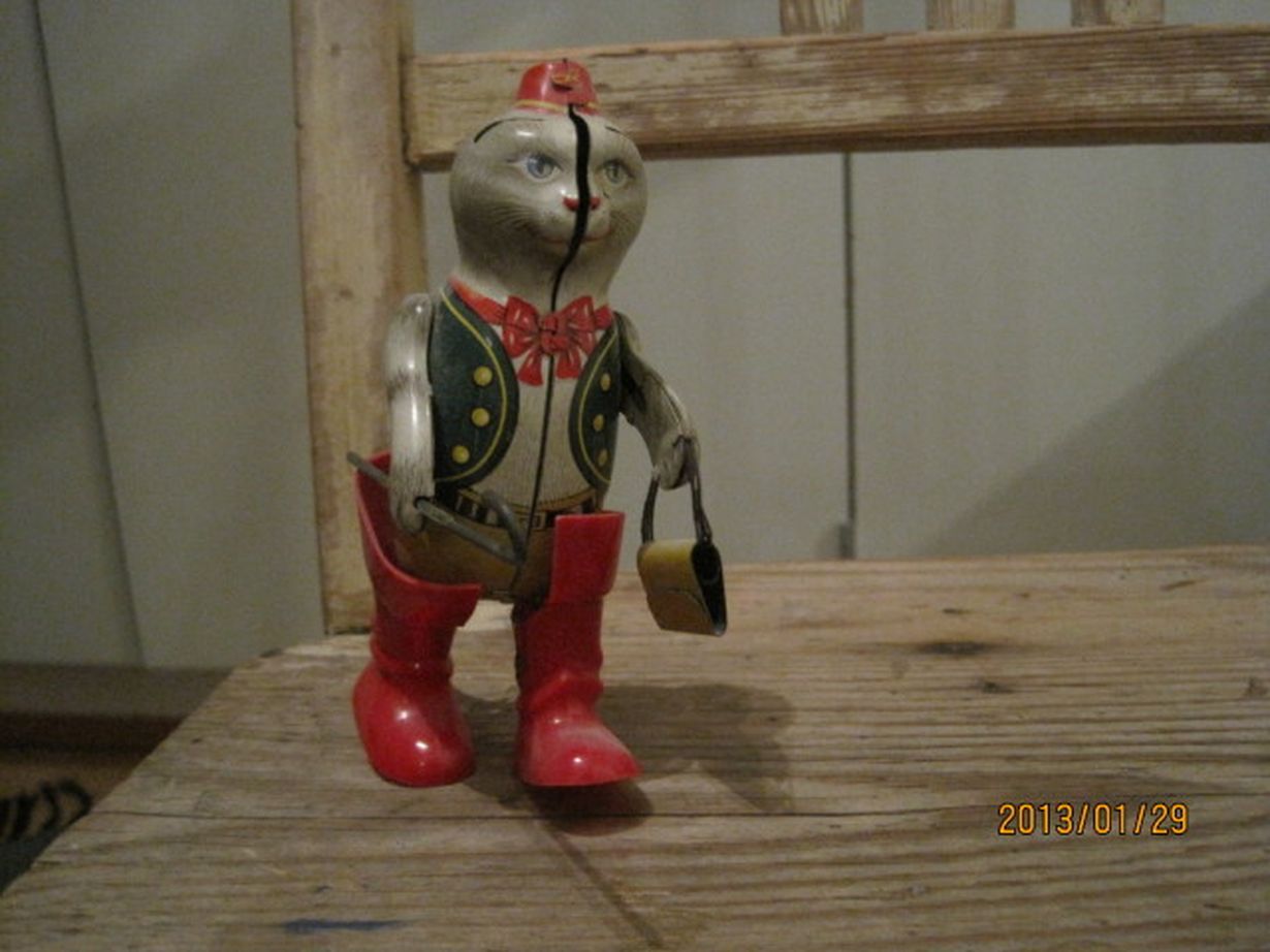 Vieterillä vedettävä peltinen kävelevä saapasjalkakissa, korkeus n. 15 cm. Olen saanut sen kummitädiltäni kun olin n. 7 vuotias, n. v. 1955. Leikin sillä kaksoisveljeni kanssa silloin. Lelulla on leikkinyt myös tyttäreni joka on nyt 27 vuotias. Lelu odottaa nyt lapsenlapsia hyllyssä.