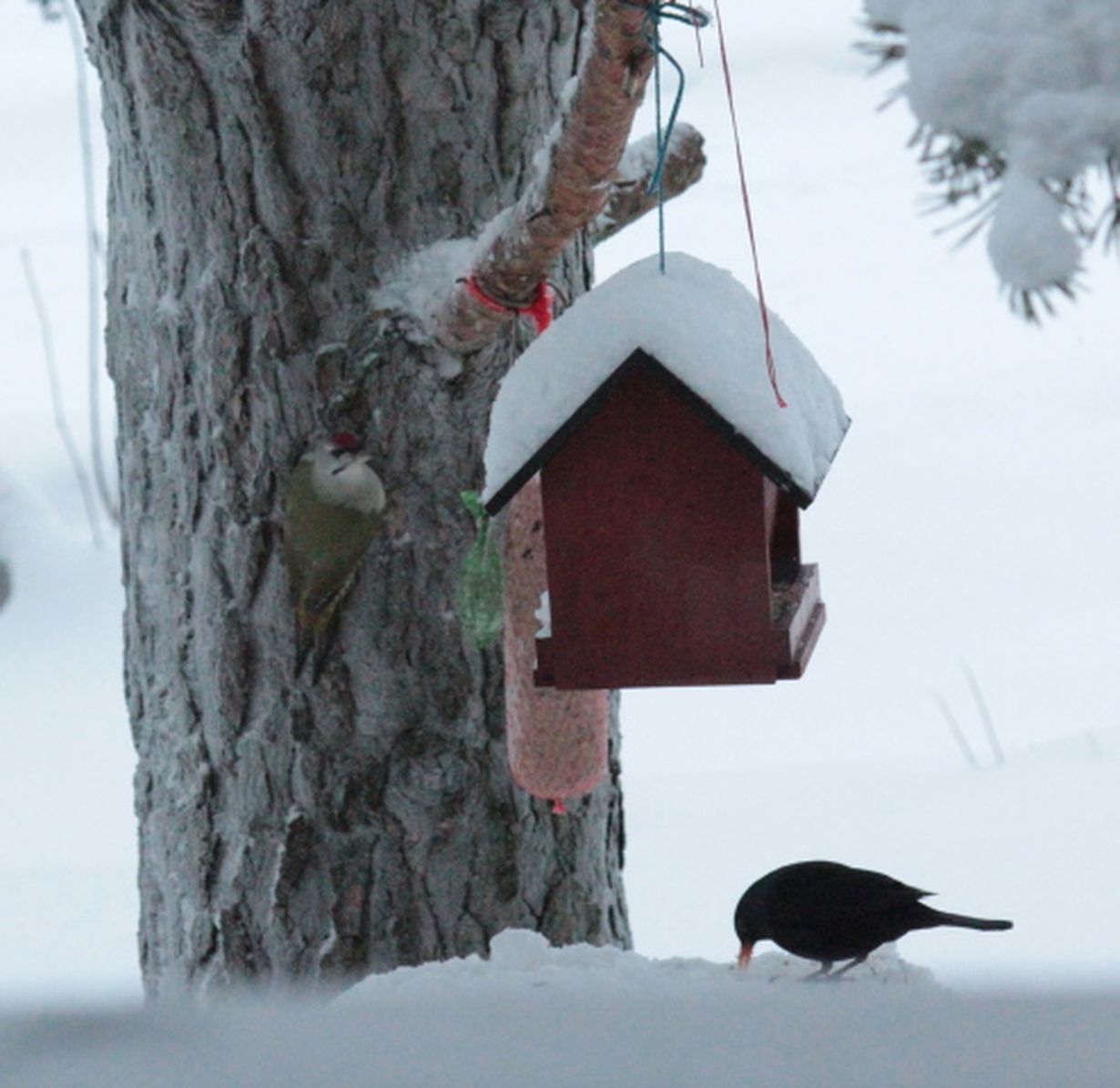 Harmaapäätikka ja Mustarastas samalla apajalla