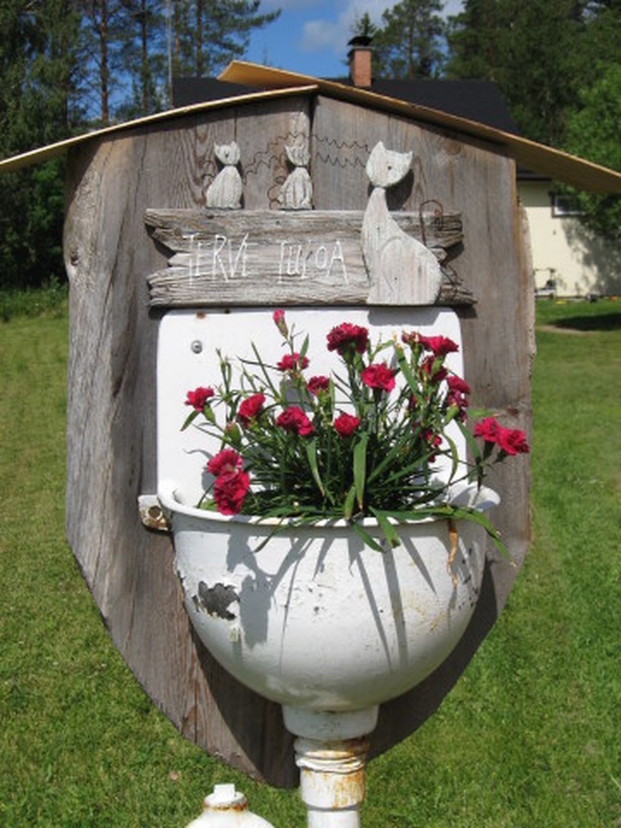 Vanhasta viemäri altaasta tehty kukka-astia/tervetulos kyltti.