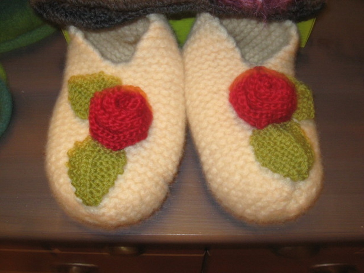 Lukijoiden kuvat: Wau, mitä käsitöitä! tossut 5.1.2012 klo 18:44 villalangalla neulotut ja kevyesti huovutetut paksut ja lämpimät tossut tädille syntymäpäivälahjaksi.